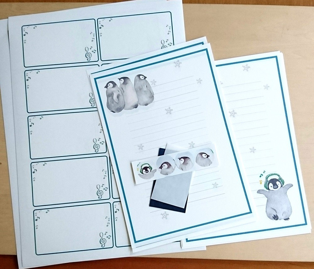 このペンギンのイラストで他にも『小さなお便りセット』『ポストカード』『スマホカバー』『パスケース』など