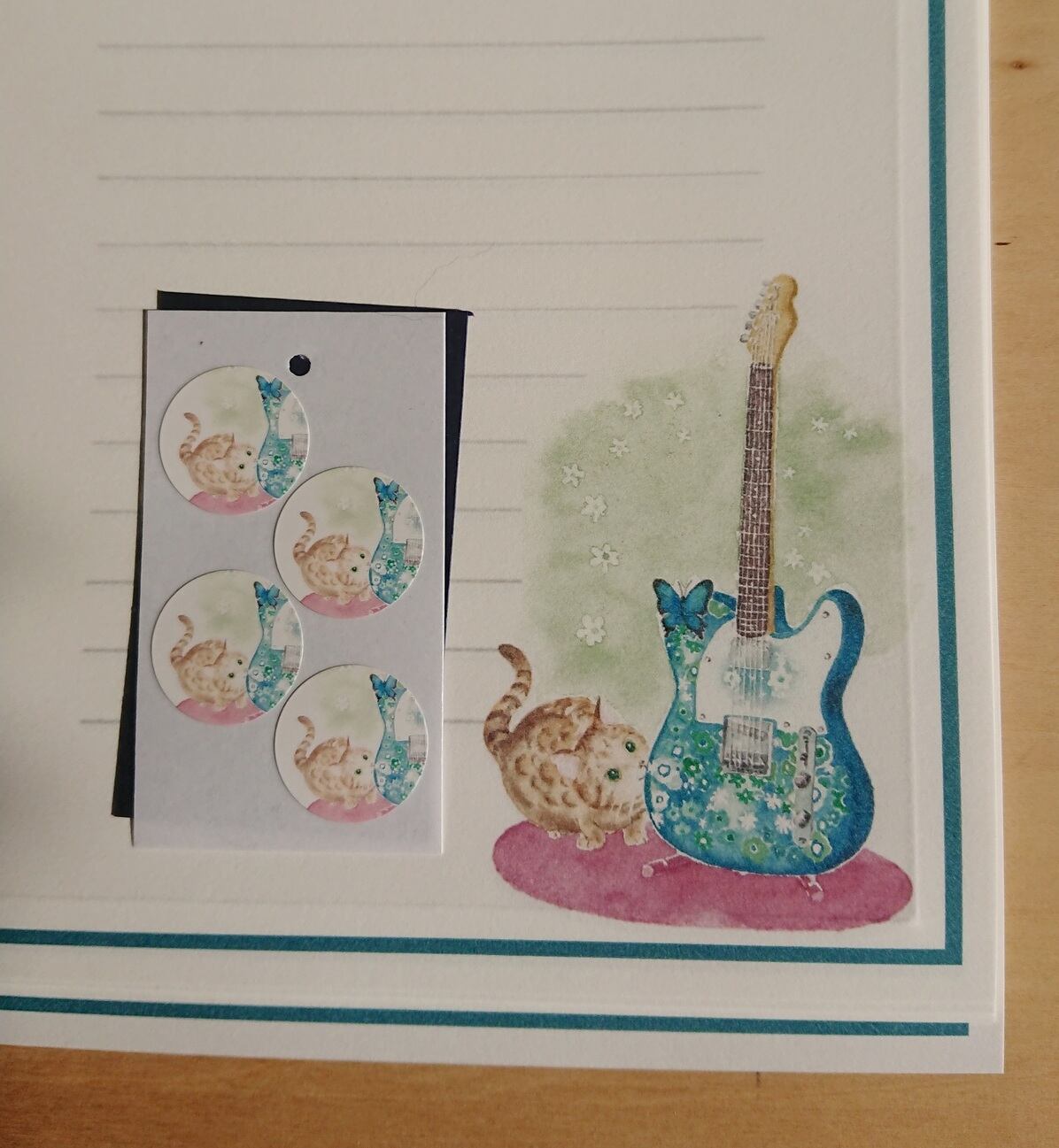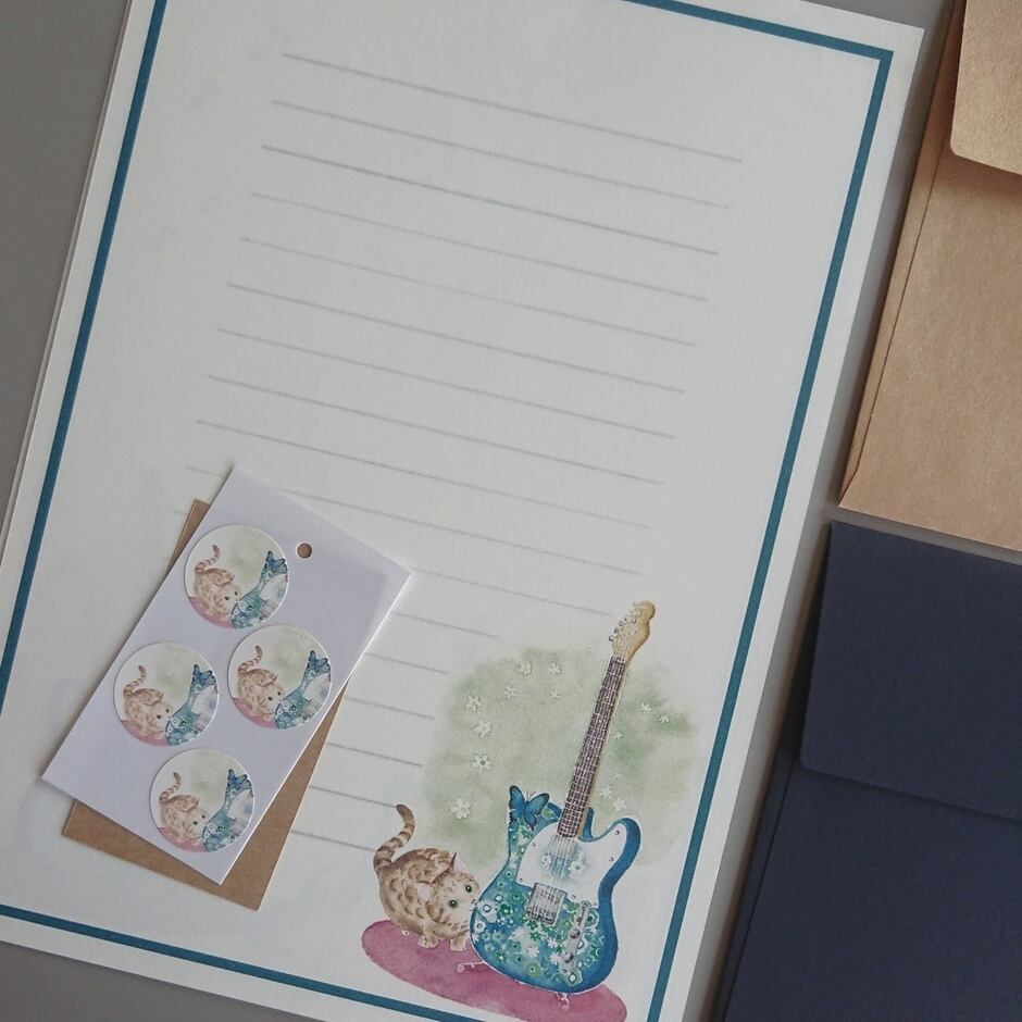 猫とギター好きさんのレターセット《ブルーフラワー》