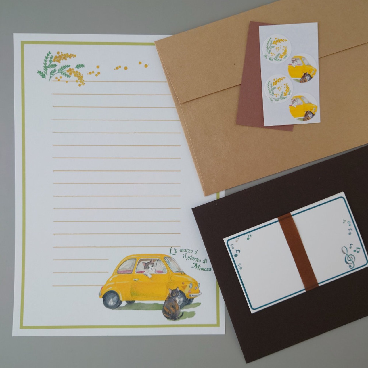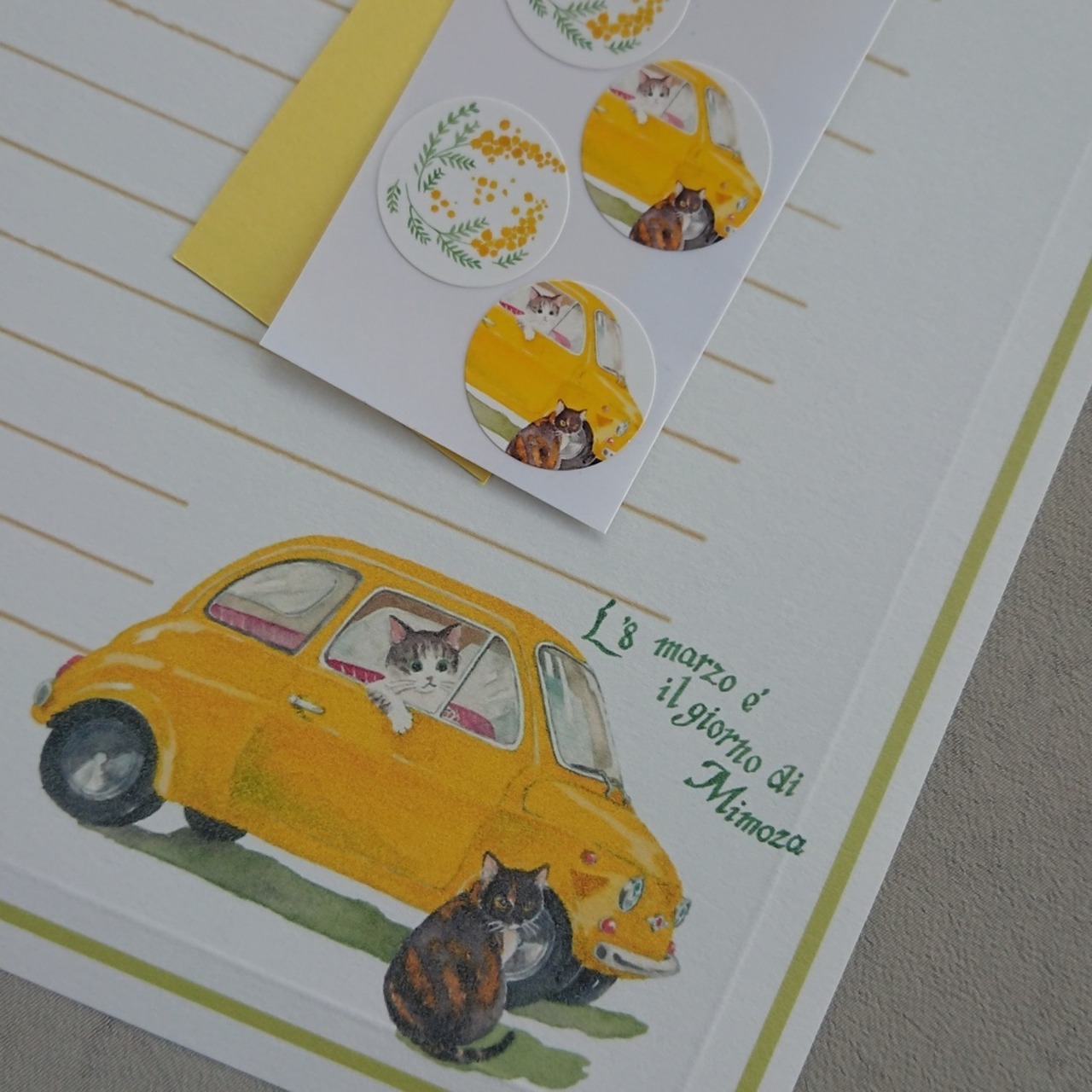この季節にぴったりなミモザ色のフィアットと二匹のにゃんこを描いた春色のレターセットです。