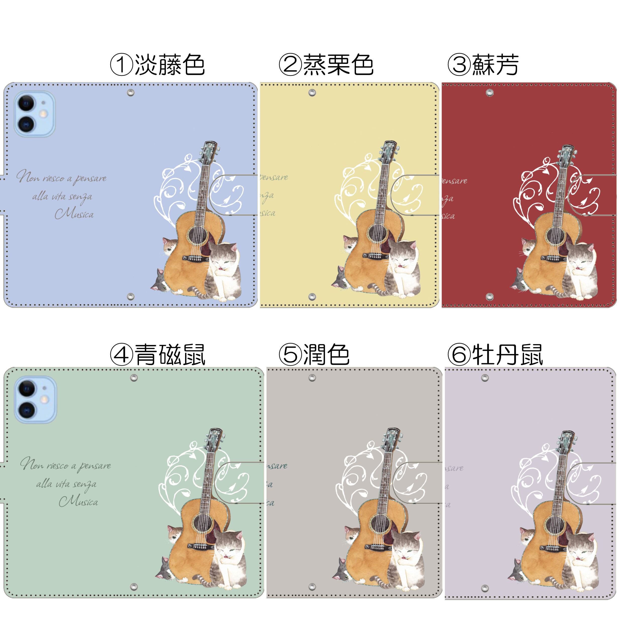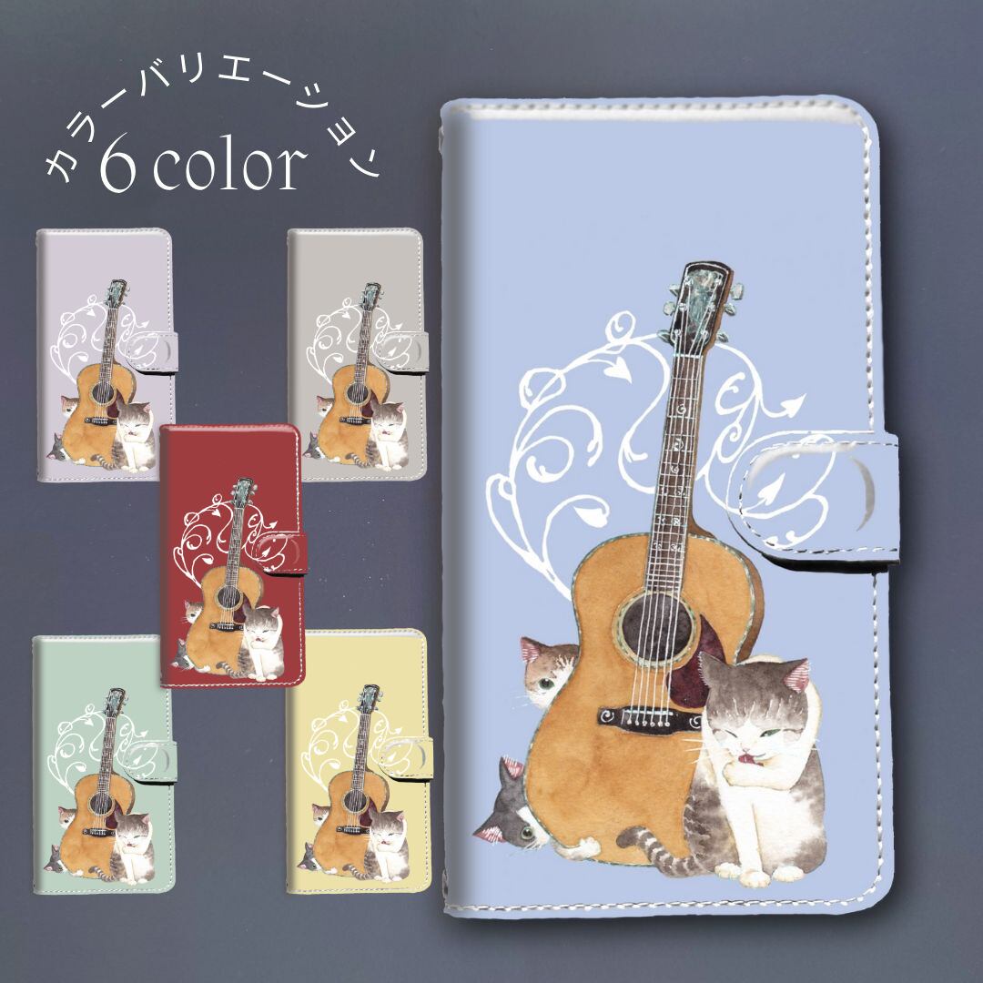 名入れ可*ベルト付き背面ケースに変更可*ストラップホール2か所*ほぼ全機種対応 手帳型*猫とギター【遊んで】